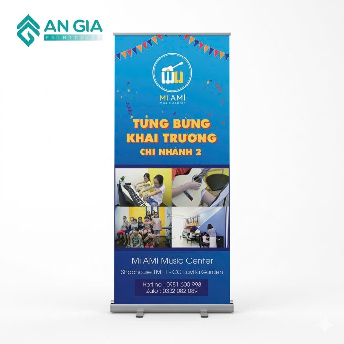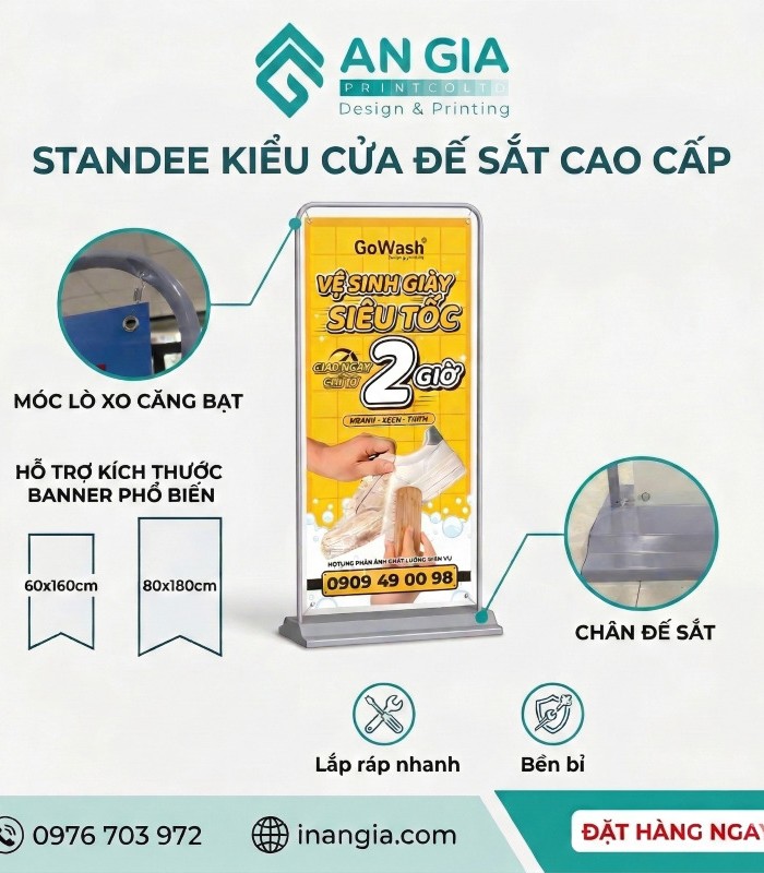 In An Gia đã thực hiện làm standee quảng cáo cho nhiều lĩnh vực: bán lẻ, F&B, giáo dục, bất động sản, tài chính, y tế, thời trang, mỹ phẩm, sự kiện sinh viên… Mỗi ngành có đặc thù riêng về nội dung, màu sắc, hình ảnh và thông điệp. Nhờ kinh nghiệm này, đội ngũ có thể tư vấn chính xác hơn về cách thiết kế và bố trí standee để đạt hiệu quả truyền thông tối ưu.